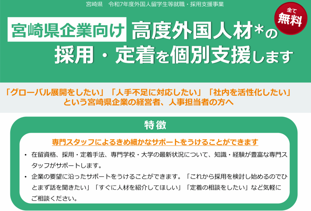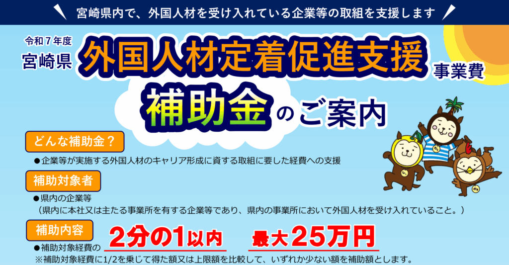 宮崎県外国人材定着促進支援事業費補助金の補助事業者を募集しています。この補助金は、中長期的に本県産業を支える外国人材の定着促進を図るため、宮崎県内の企業等が受け入れている外国人材のキャリア形成支援に資する取組等に要する経費の一部を補助するものです。