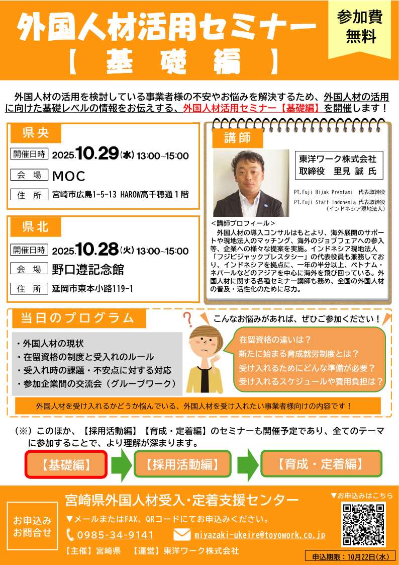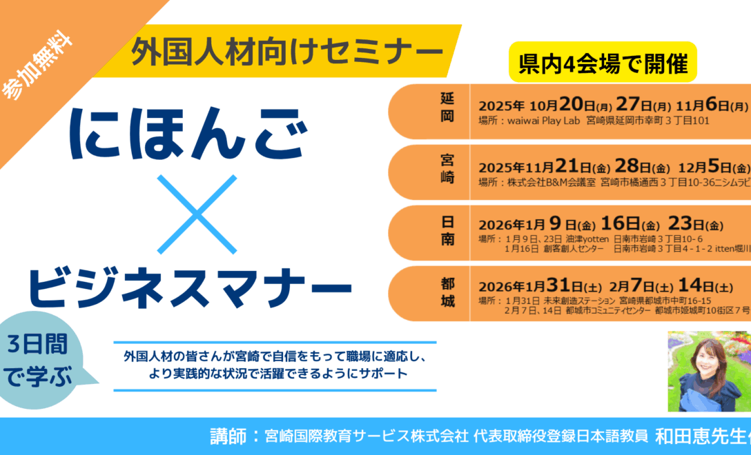 - 外国人材の皆さんが宮崎で自信をもって職場に適応し、活躍できるよう、仕事で必要とされる日本語やビジネスマナーセミナーの講座を開催します。